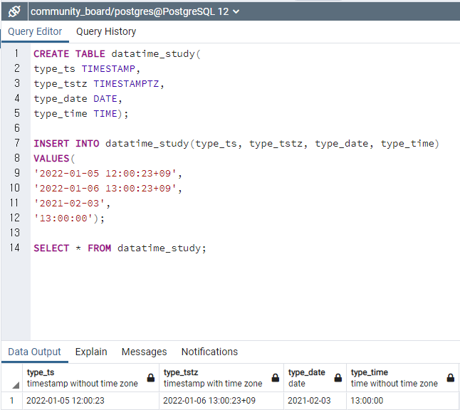 데이터 성격에 맞는 데이터 타입을 선택해야 PostgreSQL이 더 빠르고 정확하게 우리가 원하는 역할을 수행함 데이터 타입 프로그래밍에서 변수 선언 시 변수 앞에 데이터 타입 선언해서 변수의 성질을 정의하는 것과 비슷함 숫자형 PostgreSQL에서 변수는 소문자로 관리됨 데이터 타입 설명 저장용량 INTEGER - 소수점 자리를 제외한 정수만 입력 - 축약한 INT로 작성해도 됨 - 숫자 길이 제한 불가 4bytes NUMERIC(p,q) - 소수점자리 표시 가능 - DECIMAL과 같음 - p에는 전체 자릿수, q는 소수점 자릿수 입력 - q를 빼면 p자리 정수를 의미함 가변 FLOAT - 부동소수점 활용한 연산 4bytes, 8bytes SERIAL - INTEGER를 기본값으로 1씩 추가됨 - ..
